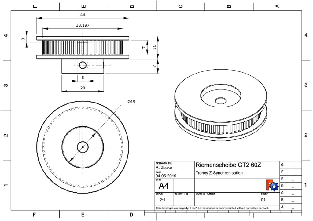 Die Zeichnung der Riemenscheibe. Es muß eine 3mm tiefe Aussparung mit D=19mm für die Flex-Kupplung hinzugefügt werden.
