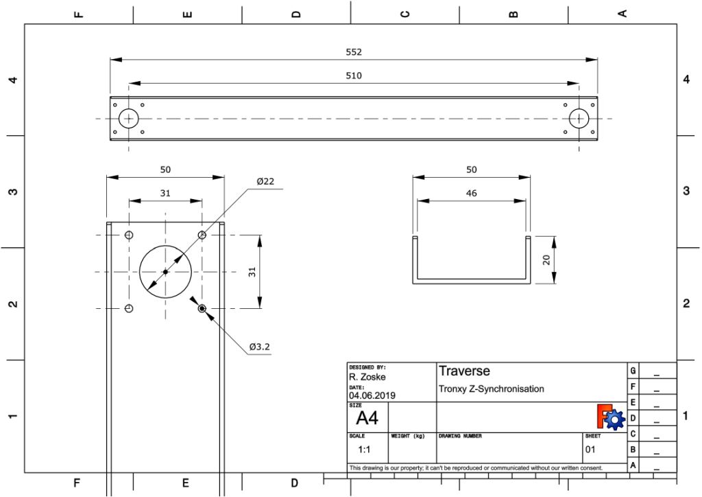Die Zeichnung der Traverse. Sie besteht aus Aluminium-U-Profil 50x20x2 (L=552). Quelle: Amazon ("Aluminium U-Profil AlMgSi05 BxHxS 50x20x2mm Zuschnitt")