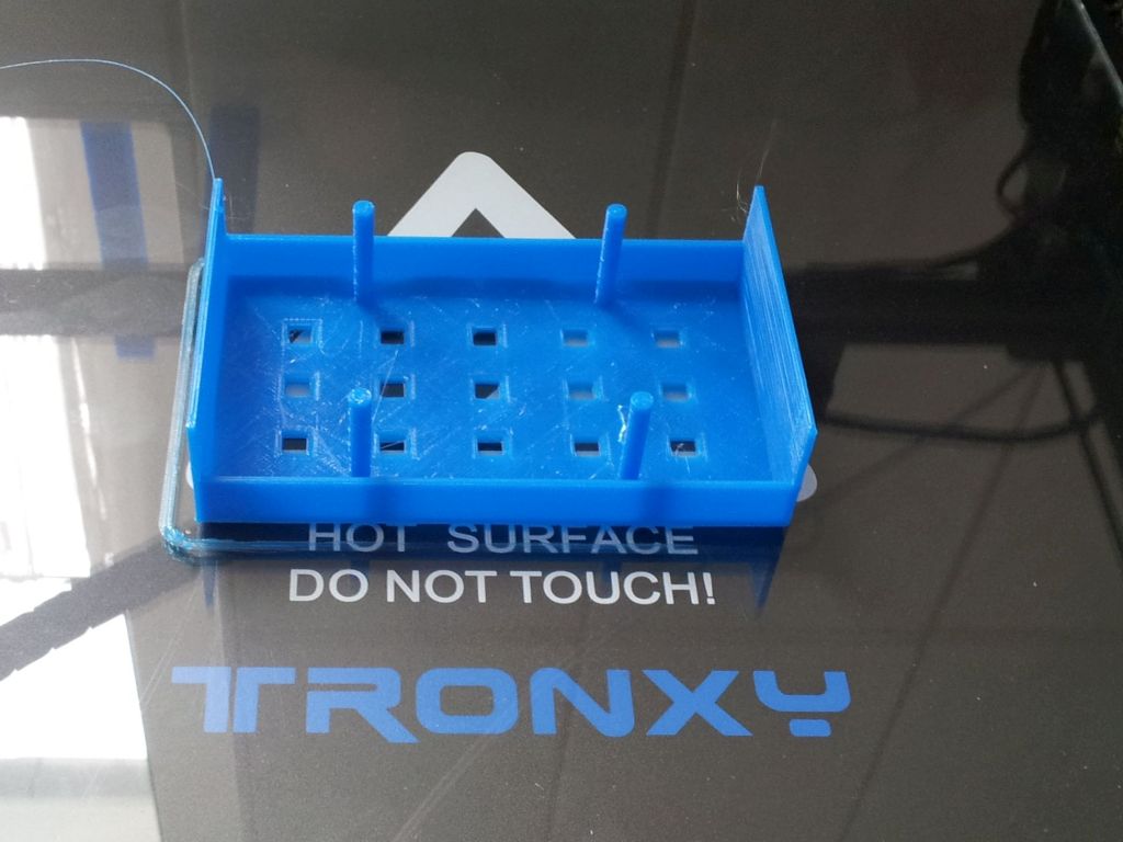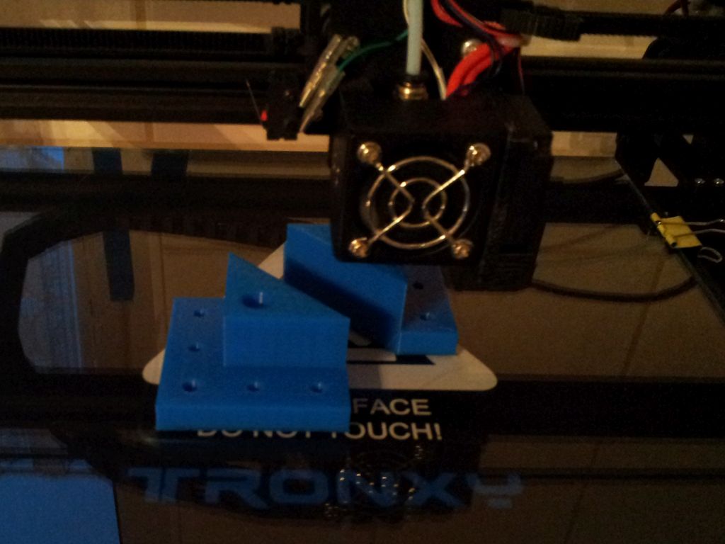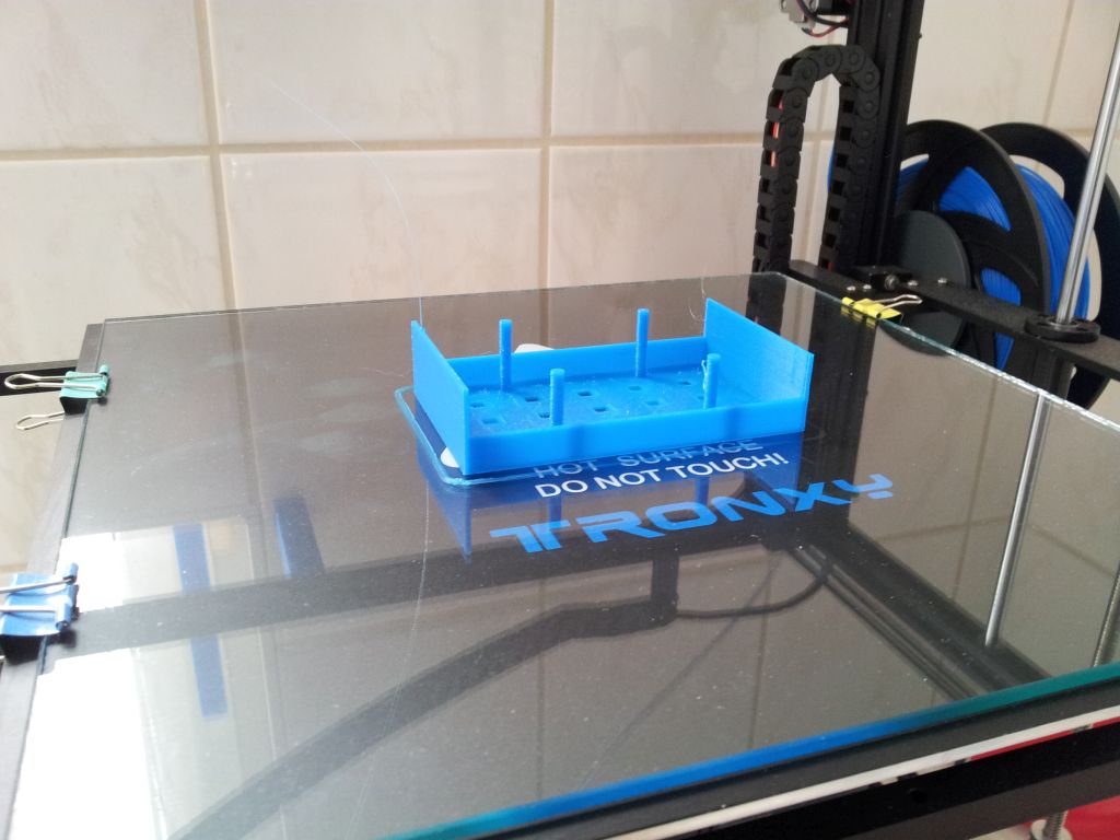 Die 2 vorderen Eckplatten für die Umlenkrollen sind hier gerade in Arbeit. Die vor jedem Druckbeginn stets mit einfachem Spülmittel (FIT) gereinigte Glasplatte löst (zusammen mit der 24V-Versorgung des Heizbettes), zumindest bei der Verarbeitung von PLA, alle Haftungsprobleme.