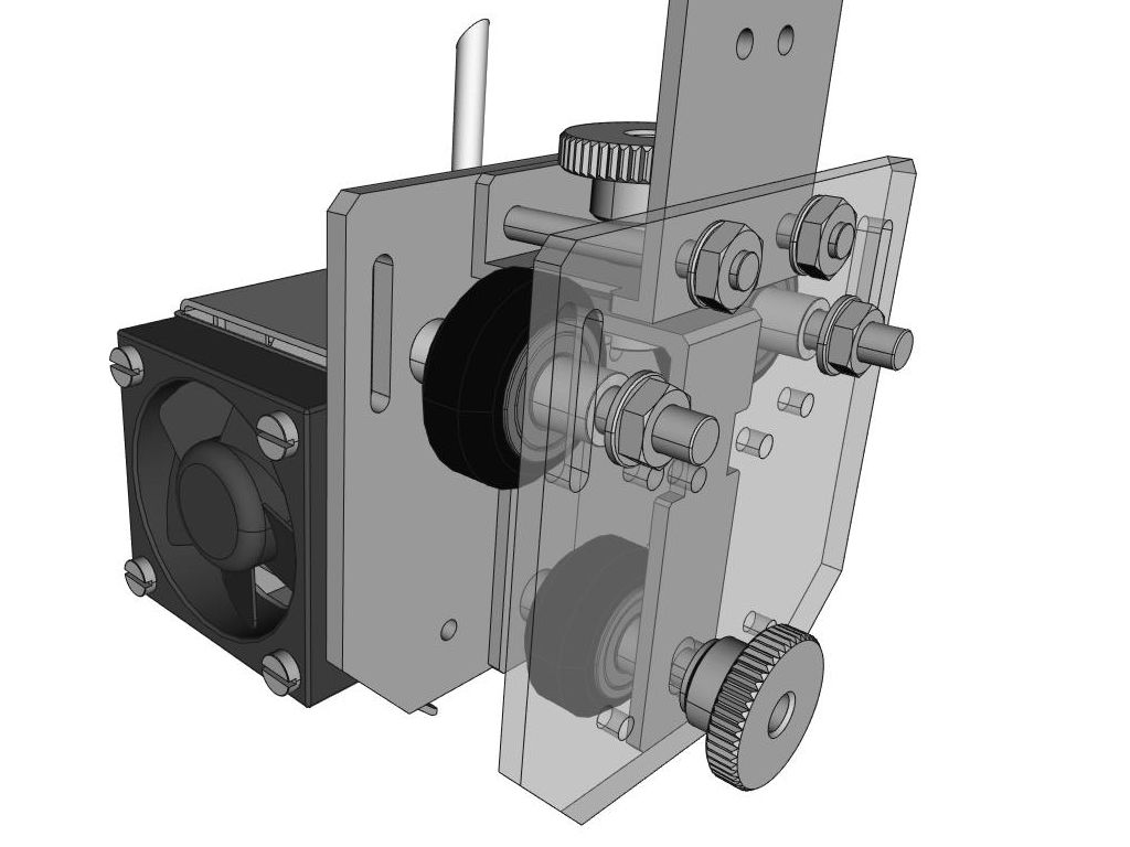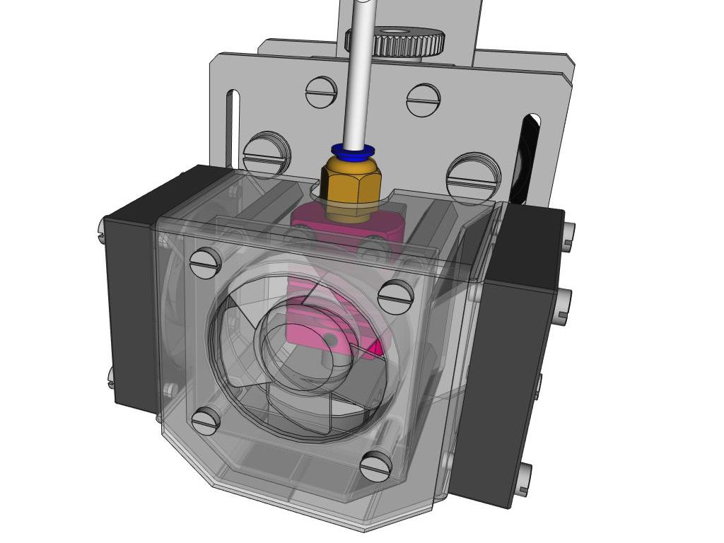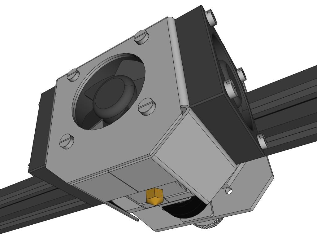 Hot End Umbau mit 2 seitlichen Bauteil-Kühlern und verbesserter Luftführung durch 2 ineinander verschachtelte Führungsbleche. Zwischen diesen Blechteilen wird der Luftstrom beider Lüfter direkt zum Druckteil geführt. (Status: Projekt)